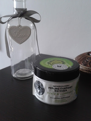 Zadowolona z zakupu przy wieczornym prysznicu postanowiłam go od razu wypróbować. I co się okazuje? Zapach jakiś sztuczny - no ok czuć to kiwi z przewagą limonki ale jakoś coś nie gra. Po kilku użyciach zapachu mam już dość. A jeszcze tyle użyć przed nami! Bo ja kosmetyków to wyrzucać nie lubię, z resztą nic nie lubię wyrzucać :) Wracając do peelingu. Konsystencja zbita, galaretowata z wyczuwalnymi grudkami - myślę sobie - super o to mi chodziło. Ale kiedy zaczęłam go rozcierać na nogach jakiś dramat. Strasznie tłuścił nogi - czyt. tłuścił nie nawilżał jak mają to inne peelingi. Grudek to on ma w sobie dużo więc za to plus ale to chyba jedyny plus tego produktu. Tym bardziej na plus, że producent napisał na produkcie, że zawiera naturalne kryształki cukru. Po peelingu zawsze depilowałam nogi a przy tym się nie da. Strasznie zapycha maszynkę i nie ma mowy o jakiekolwiek depilacji, Wracając do tego tłuszczenia to peeling zawiera olej kawowy i kokosowy. Fajny akcent takich naturalnych składników ale czegoś tutaj jest za dużo.